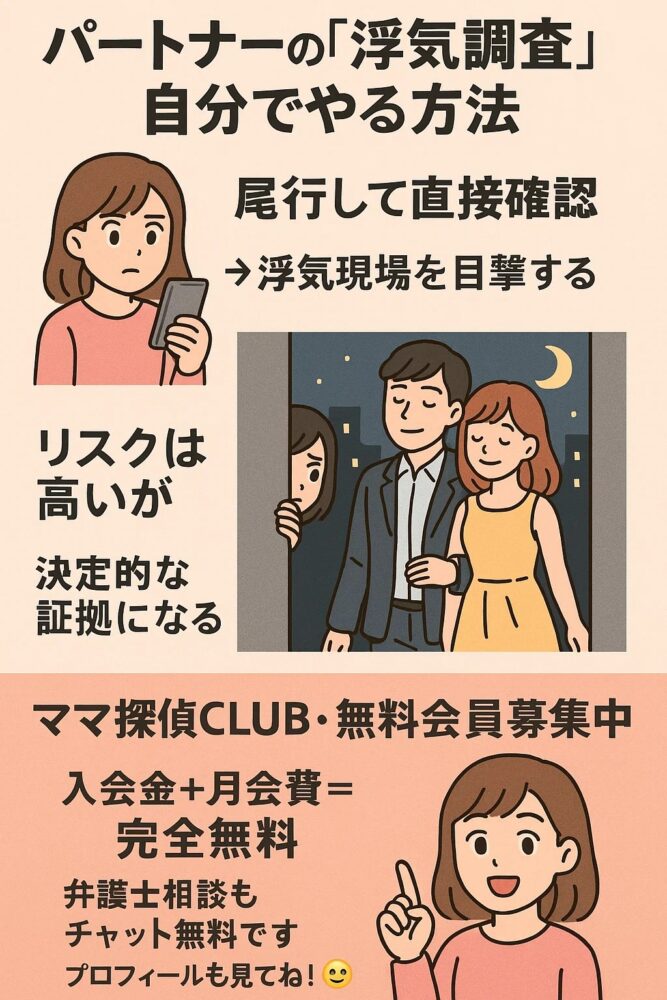 金曜の夜に遅い時や、土日の昼間にいないときには、女性と会っているのではないかと思います。でも、自分で夫を尾行して調べるのは嫌です。私が被害者なのに、影でコソコソと様子を伺っているのは、なんだか情けないです。