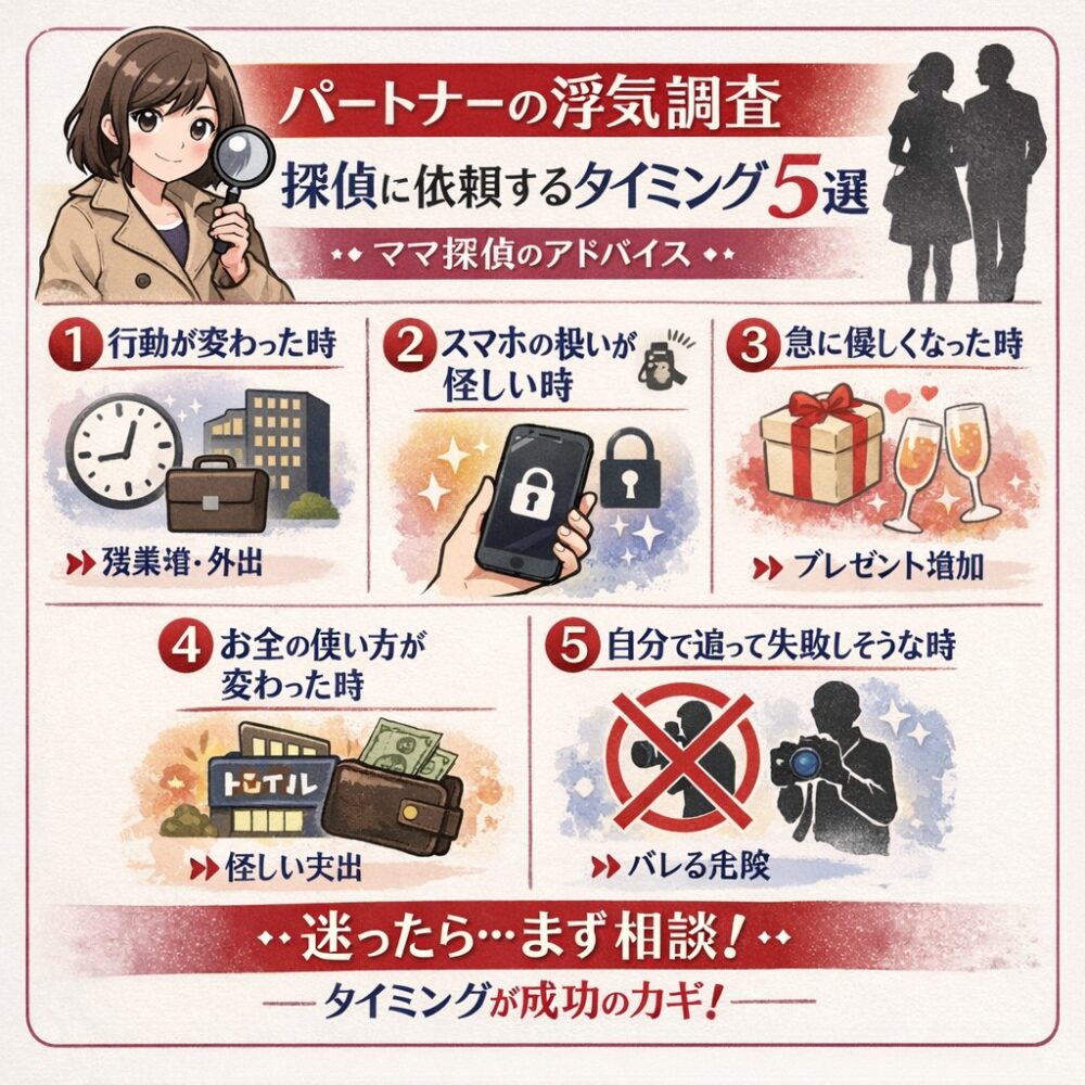 🔵【ママ探偵】パートナーの「浮気調査」探偵に依頼するタイミングは?…5選