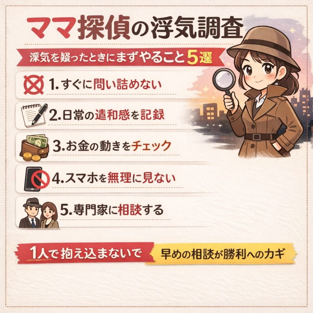 🔵【ママ探偵】パートナーの「浮気調査」浮気を疑ったときにまずやること…5選