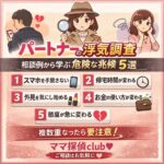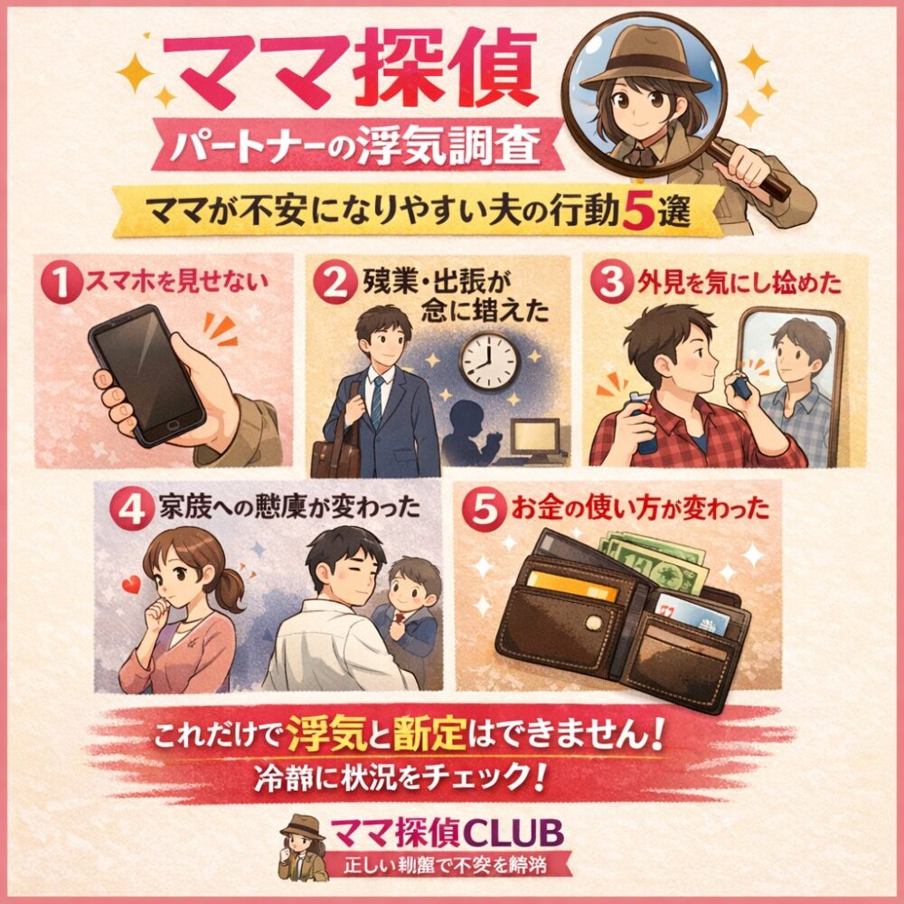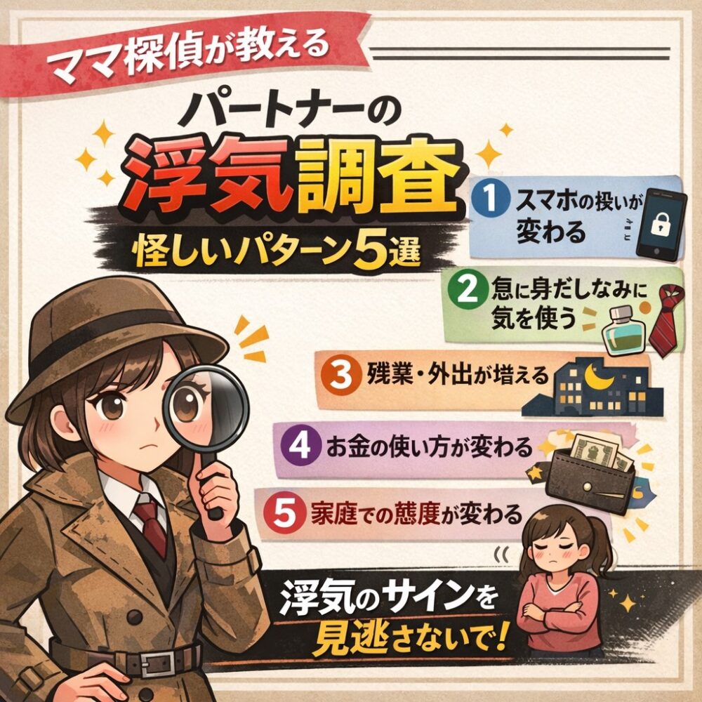 2026年3月10日 / 最終更新日時 : 2026年3月10日 astotantei 👧浮気調査 🔵【ママ探偵】パートナーの「浮気調査」探偵が実際に見た“怪しいパターン”5選 アスト探偵事務所大阪 京都滋賀 奈良 兵庫 和歌山 お持ちの悩み(問題)を解決しませんか???。楽しい毎日、幸せな生活を取り戻しましょう。「探偵の知恵袋」好評/配信中!!アスト探偵事務所は相談無料です。お気軽にご相談ください。 無限ループ 【ママ探偵】パートナーの「浮気調査」探偵が実際に見た“怪しいパターン”5選 はじめに 「もしかして浮気…?」そう感じたとき、多くの方がまず気になるのは パートナーの行動の変化です。 read more