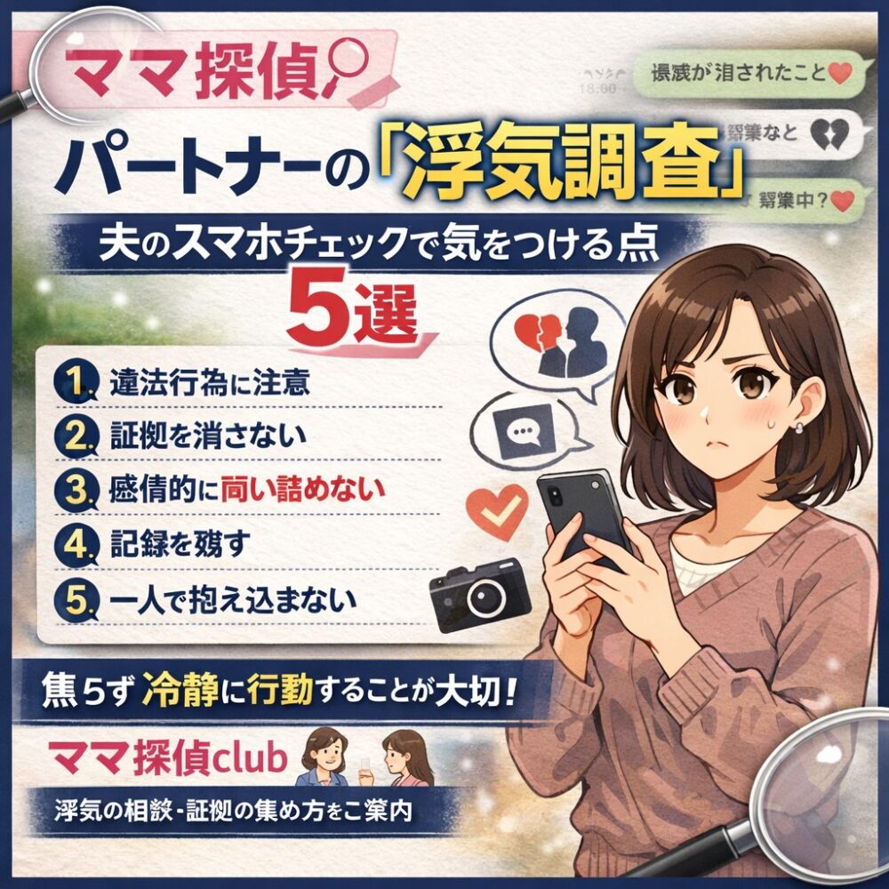 2026年3月11日 / 最終更新日時 : 2026年3月11日 astotantei 👧浮気調査 🔵【ママ探偵】パートナーの「浮気調査」夫のスマホチェックで気をつける点5選 アスト探偵事務所大阪 京都滋賀 奈良 兵庫 和歌山 お持ちの悩み(問題)を解決しませんか???。楽しい毎日、幸せな生活を取り戻しましょう。「探偵の知恵袋」好評/配信中!!アスト探偵事務所は相談無料です。お気軽にご相談ください。 無限ループ 【ママ探偵】パートナーの「浮気調査」夫のスマホチェックで気をつける点5選 はじめに パートナーの行動に違和感を感じたとき、多くの方が最初に気になるのが「スマホ」です。スマートフォンには、連絡・写真・行動履歴など多くの情報が残るため、浮気の手がかりが見つかるケースも少なくありません。 read more