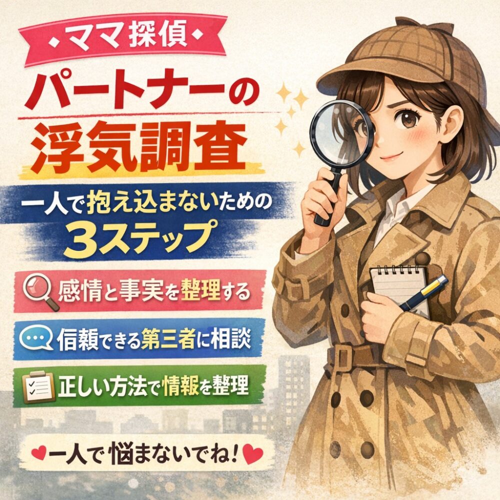 2026年3月13日 / 最終更新日時 : 2026年3月13日 astotantei 👧浮気調査 🔵【ママ探偵】パートナーの「浮気調査」一人で抱え込まないための3ステップ アスト探偵事務所大阪 京都滋賀 奈良 兵庫 和歌山 お持ちの悩み(問題)を解決しませんか???。楽しい毎日、幸せな生活を取り戻しましょう。「探偵の知恵袋」好評/配信中!!アスト探偵事務所は相談無料です。お気軽にご相談ください。 無限ループ 【ママ探偵】パートナーの「浮気調査」一人で抱え込まないための3ステップ はじめに パートナーの浮気を疑った時、多くの方が 誰にも相談できず、一人で悩み続けてしまいます。 read more